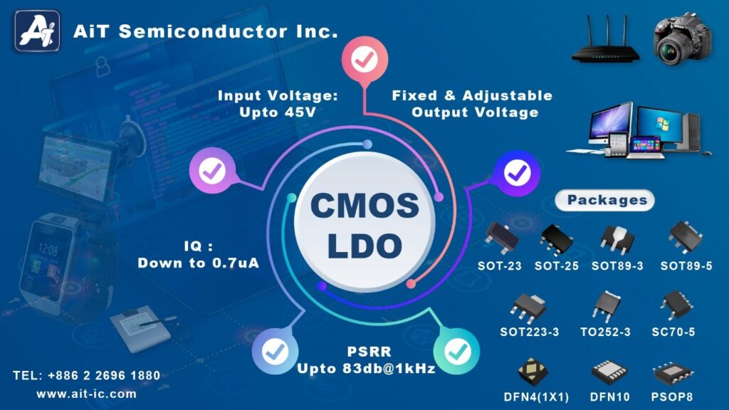 The CMOS LDO is Available in SOT-23, SOT-25, SOT89-3, SOT89-5, SOT223-3, TO252-3, SC70-5, DFN4 (1X1), DFN 10, PSOP8 Packages.