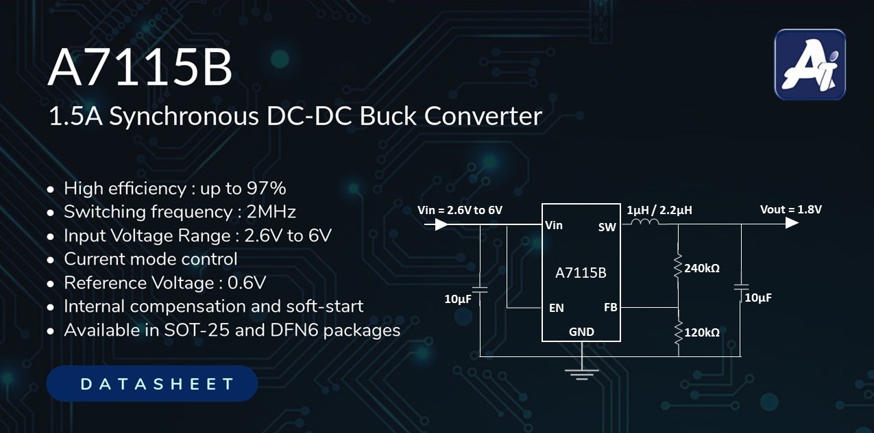 The A7115B is a 2MHz high-efficiency, PWM step-down converter with integrated main switch and synchronous rectifier that is ideal for powering portable equipment that runs from a single Li-on or Li-Polymer battery.
