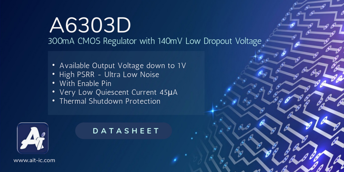 A6303D is Highly precise, Ultra Low Noise 300mA CMOS Low Dropout Voltage Regulator for Power Management Units in Portable Electronic Applications.